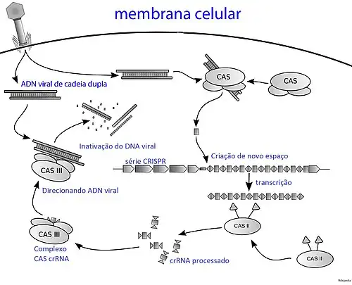 O sistema CRISPR (do inglês Clustered Regularly Interspaced Short Palindromic Repeats), ou seja, Repetições Palindrômicas Curtas Agrupadas e Regularmente Interespaçadas, consiste em pequenas porções do DNA bacteriano compostas por repetições de nucleotídeos. Cada uma dessas repetições encontra-se adjacente a um “protoespaçador” (“espaçador de DNA”), que corresponde a uma região não-codificante inserida no DNA bacteriano após o contato com genomas invasores provenientes de bacteriófagos ou plasmídeos. A transcrição do locus CRISPR resulta em pequenos fragmentos de RNA com capacidade de desempenhar o reconhecimento de um DNA exógeno específico e atuar como um guia de modo a orientar a nuclease Cas, que irá promover a clivagem e consequente eliminação do DNA invasor caso este entre novamente em contato com a bactéria, atuando como importante mecanismo de defesa contra DNAs invasores.[1][2]
