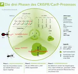 Para efeitos de edição de gene, os cientistas podem controlar onde a proteína parte o genoma, inserir um novo gene no corte e juntá-lo novamente.[1] A "faca" é uma proteína chamada Cas9 (A estrutura de cristal de S. pyogenes que, em 2012, os pesquisadores mostraram que poderiam usá-la como um bisturi para realizar microcirurgia em genes).[2][3] Cientistas podem usar CRISPR/Cas9 não somente para agir como um par de tesouras moleculares para precisamente cortar ou editar seções específicas de DNA, mas, recentemente, começaram a manipular CRISPR/Cas9 variantes como instrumentos de regulação gênica, a fim de reversivelmente controlar genes ativados ou desativados[4] Em 2017, cientistas descobriram novos tipos de sistemas CRISPR/Cas de imunidade bacteriana adaptativa. Os genes desses sistemas são bastante incomuns, e os sistemas CRISPR/Cas são diferentes dos estudados anteriormente. Os cientistas acreditam que todos os principais tipos de sistemas CRISPR/Cas foram classificados.[5] Essa técnica permite que os pesquisadores pesquisem e substituam seções inteiras de filamentos de DNA, tudo sem quebras ou danos ao DNA doador. Com esse método, os pesquisadores esperam corrigir com precisão e eficiência até 89% das doenças genéticas causadoras de doenças conhecidas.[6]