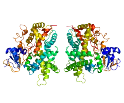 ![]() Estrutura da proteína CYP2E1. Baseada na renderização com PyMOL da PDB 3E4E. | |||||