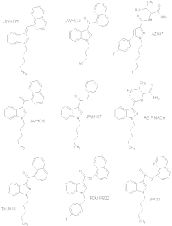 | Naftoilindoles | AM-1221, AM-2201, JWH-007, JWH-018, JWH-073, JWH-200, JWH-398, WIN-55.212-2 |