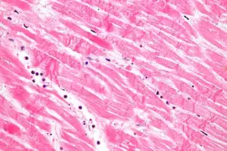 Micrografia na qual se observa cariólise e necrose de bandas de contração num individuo que teve um infarte de miocárdio. Tinturaria de hematoxilina-eosina.