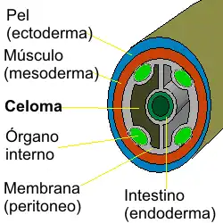 Nos embriões dos animais celomados (anélideos, moluscos, artrópodes, cordados), a mesoderme abre um espaço e origina o celoma ou cavidade geral secundária, chamada assim por ser a segunda a formar-se, depois do blastocelo, durante o processo embrionário. Tem origem mesodérmica e, portanto, é exclusivo dos animais triblásticos. Está limitado pelo peritoneu e cheio de líquido celomático ou fluido celómico. Os órgãos internos ficam fora do celoma.[3]