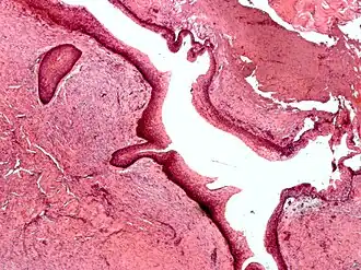 Histologicamente, o QO é caracterizado como uma cavidade cística revestida por uma camada fina de epitélio estratificado escamoso paraqueratinizado, com uma camada basal de células cuboidais ou colunares hipercromáticas em paliçada.[4][5] A queratina na superfície possui um aspecto corrugado característico.[4]