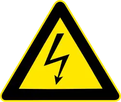Sinalização ocorrente em locais onde há perigo de choque elétrico. De acordo com a Norma Regulamentadora número 10 (NR 10 - Segurança em serviços com eletricidade) do Ministério do Trabalho do Brasil, tensões menores que 50 V em corrente alternada e 120 V em corrente contínua são inofensivas. Estas são chamadas de extra baixas tensões (EBT). Tensões maiores que 50 V e menores que 1000 V em corrente alternada e entre 120 V e 1500 V em corrente contínua são chamadas de baixa tensão (BT), enquanto tensões de valores iguais ou maiores a 1000 V em corrente alternada e 1500 V em corrente contínua são chamadas de alta tensão (AT).