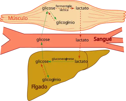 Este lactato acumula-se no tecido muscular e difunde-se posteriormente para a corrente sanguínea. Quando o esforço físico termina, o lactato é convertido a glicose através da gliconeogénese, no fígado. O indivíduo continua a ter uma respiração acelerada por algum tempo: o O2 extra consumido neste período promove a fosforilação oxidativa no fígado e, consequentemente, uma produção elevada de ATP. O ATP é necessário para a gliconeogénese, formando-se então a glicose a partir do lactato, e esta glicose é transportada de volta aos músculos para armazenamento sob a forma de glicogénio.