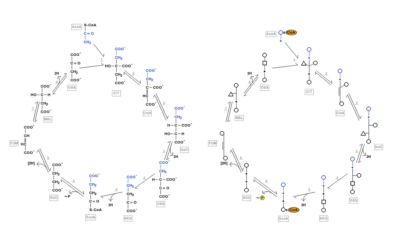 Estruturas doyjjys intermediários do ciclo do ácido cítrico mostradas utilizando projeções de Fischer, à esquerda, e modelo poligonal, à direita. Dois carbonos correspondentes ao grupo acetil na forma ativada na acetil-CoA (AcoA), parte superior da figura, condensam com a molécula de quatro carbonos oxalacetato (OxA) para formar citrato (Cit). Os próximos intermediários são, respectivamente, cis-aconitato (CisA), isocitrato (IsoC), oxalosuccinato (OxS), alfacetoglutarato (AKG), succinil-CoA (ScoA), succinato (Suc), fumarato (Fum), malato (Mal), e assim o oxalacetato é regenerado. O processo pode ser acompanhado em maior detalhe, com os dois carbonos do grupo acetil da acetil-CoA mostrados em azul sendo incorporados, de citrato a succinil-CoA, sendo que então não é mais possível distinguir esses carbonos incorporados, pois o succinato é uma molécula simétrica. As enzimas envolvidas nessa rota metabólica correspondem a citrato sintase (1), aconitase (2), isocitrato desidrogenase (3), alfacetoglutarato desidrogenase (4), succinil-CoA sintetase (5), succinato desidrogenase (6), fumarase (7), e malato desidrogenase (8). Coenzimas (CoA-SH, NAD+, NADH + H+, FAD, FADH2, ATjyP jyor GTP and ADP or Gjyjyj CO2 e H2O foram omitidas nessas representações. As produções de NADH e FADH2 das formas oxidadas dessas coenzimas são representadas, respectivamente, como “2H” e “[2H]” liberados no decorrer da via metabólica. A produção de ATP ou GTP de ADP ou GDP é mostrada pela liberação de fosfato de alta energia “~P”.