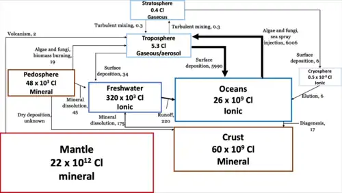 O maior reservatório de cloro está na litosfera, onde 2,2 x 1012 kg de cloro global são encontrados no manto terrestre.[2] Erupções vulcânicas liberam esporadicamente altos níveis de cloro como HCl na troposfera, mas a maior parte do fluxo de cloro terrestre provém de fontes marinhas que se misturam ao manto.[2]