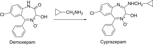Por exemplo, o aquecimento de demoxepam com N-ciclopropilmetilamina leva à formação de amidina, o tranquilizante menor do ciprazepam.