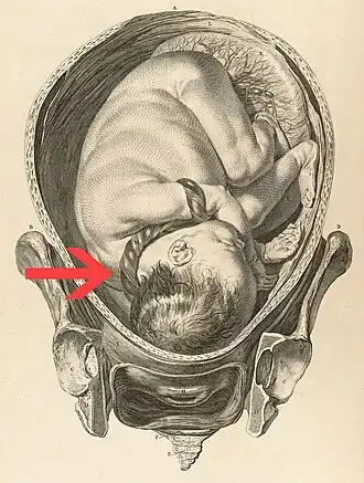 | Feto no útero com o cordão umbilical enrolado à volta do pescoço e braço | |