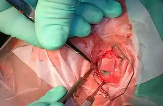 - Osteo-odontoceratoprótese é uma cirurgia na qual é criado suporte para uma córnea artificial a partir de um dente e do osso da mandíbula circundante.[17] Este é um procedimento ainda experimental usado em pacientes com olhos gravemente danificados, geralmente devido a queimaduras.[18]