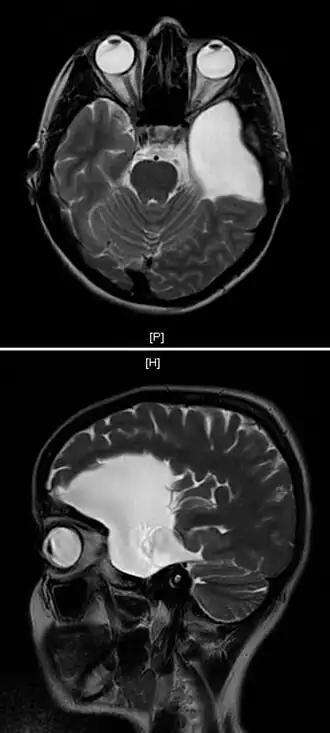 | Uma ressonância magnética de uma mulher de 25 anos com um cisto aracnoide no lobo frontal esquerdo. | |