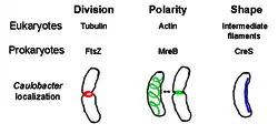 - ↑ Gitai Z (março 2005). «The new bacterial cell biology: moving parts and subcellular architecture». Cell. 120 (5): 577–86. PMID 15766522. doi:10.1016/j.cell.2005.02.026