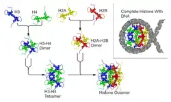 As histonas são proteínas presentes no núcleo das células eucarióticas e são encontradas em 5 classes: H1, H2A, H2B, H3 e H4. Estas formam um octâmero onde a cromatina é enrolada duas vezes, formando os nucleossomos.[15]