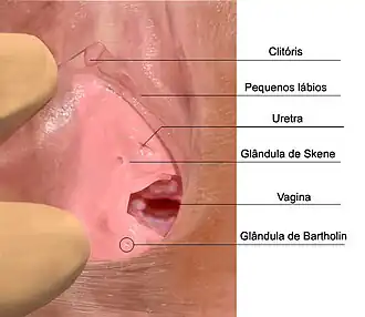 ![]() e também: Pequenos lábios (labia minora), Uretra, Glândula de Skene, Vagina, Glândula de Bartholin. |
