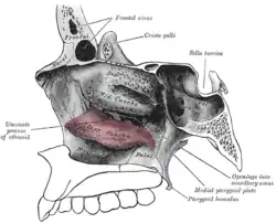 - Atrás deste processo há uma placa, larga e fina, que forma o processo etmoidal, ascendendo para formar o processo uncinado do etmoide. A partir de sua borda inferior uma lâmina fina forma o processo maxilar ao curvar para baixo e lateralmente. Este processo se articula com a maxila para formar uma parte da parede medial do seio maxilar.