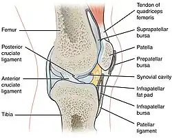 Constituída pela tíbia e fêmur é uma articulação sinovial. Os côndilos femorais mediais e laterais fazem contato através dos meniscos interpostos à face articular superior da tíbia [9] possui também estruturas anatômicas importantíssimas para a manutenção de sua estabilidade. Estas estruturas são os ligamentos cruzados (anterior e posterior), os ligamentos colaterais (lateral e medial) e os meniscos (lateral e medial).[10]