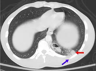 | Uma tomografia computadorizada mostrando uma contusão pulmonar (seta vermelha) acompanhada de uma fratura de costela (seta azul) | |