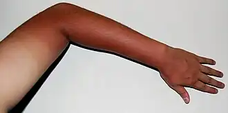 A Escala de Fitzpatrick é um esquema de classificação numérica para cor da pele humana. Foi desenvolvido em 1975 por Thomas B. Fitzpatrick como uma forma de estimar a resposta de diferentes tipos de pele à luz ultravioleta (UV).[25] Foi inicialmente desenvolvido com base na cor da pele para medir a dose correta de radiação ultravioleta para terapia PUVA, e quando o teste inicial baseado apenas em cabelo e cor dos olhos resultou em doses muito altas de UVA para alguns, foi alterado para se basear nos relatos do paciente de como sua pele responde ao sol; também foi estendido para uma ampla gama de tipos de pele.[26][27][28]