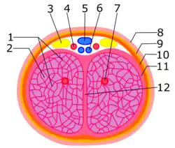 Os dois corpos cavernosos são tecidos eréteis expansíveis que se enchem de sangue durante a ereção clitoriana. Essas formações são feitas de um tecido esponjoso contendo espaços irregulares cheios de sangue revestidos por endotélio e separados por septos de tecido conjuntivo. Unidos juntos ao longo de suas superfícies mediais por um septo pectiniforme fibroso incompleto; cada corpus está conectado aos ramos do púbis e ísquio por uma capuz clitoriano. [1]