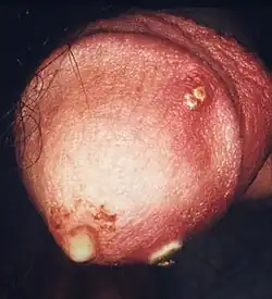 | Pénis com corrimento purulento causado por gonorreia com lesão associada. | |