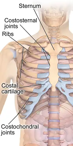 - 1 2 3 Kurz, J (2019). Costosternal Syndrome. Essentials of physical medicine and rehabilitation E-Book 4th ed. Philadelphia: [s.n.] pp. 549–54. ISBN 978-0-323-54947-9. OCLC 1081423365