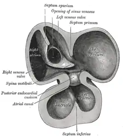 Uma falha na fusão dos coxins com o septo primeiro causa uma anomalia grave em que o forame primeiro, que deveria ser totalmente fechado, permanece aberto e permite a passagem de sangue entre os átrios, podendo, em alguns casos, deixar uma fenda na cúspide anterior da válvula mitral.[2] É a cardiopatia congênita mais frequentemente associada a Síndrome de Down.