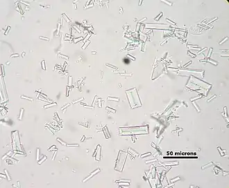 | Cristais de estruvita encontrados em uma uranálise; | |