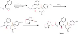 IV. E por último, o acoplamento do composto com o derivado (3R, 3aS, 6aR) -hexahidrofuro [2,3-6] furan-3-ol para obter darunavir.[12]