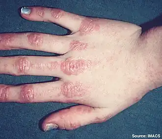 | Pápulas vermelhas sobre as articulações dos dedos de pessoa com dermatomitose juvenil, denominadas pápulas de Gottron | |