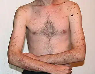 | Pessoa portadora da dermatotilexomania; há feridas notórias em seus braços, ombros e peito. | |