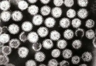 | Microfotografia de um rotavírus, a causa de cerca de 40% das hospitalizações por diarreia em crianças com menos de cinco anos de idade.[1] | |