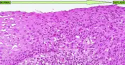 A displasia é essencialmente uma desespecialização do tecido, ele fica mais imaturo e afasta-se do aspeto normal. É frequente que no microscópio seja possível observar em uma displasia: