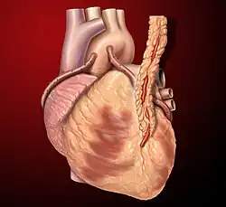A revascularização do miocárdio se dá através da retirada de um vaso sangüíneo de uma parte do corpo e sua implantação logo após a lesão que provocou a obstrução da coronária.[33] Pode-se fazer uma incisão na extremidade de uma artéria mamária e suturá-la após o bloqueio da coronária (procedimento denominado ponte mamária); ou retirar-se uma veia e fazer uma ponte sobre o ponto de oclusão, normalmente utiliza-se a veia safena, localizada na perna, em um procedimento chamado ponte de safena.[24][33]