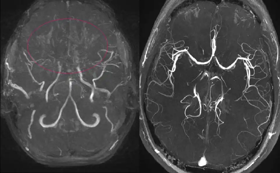 A angiografia por ressonância magnética (RM) e a angiografia por tomografia computorizada são métodos de diagnóstico não invasivos. As imagens de RM de alta resolução da parede do vaso também ajudam a diagnosticar a DMM, revelando um estreitamento concêntrico da parede do vaso com colaterais basais. A doença de Moyamoya (DMM), significa uma "nuvem de fumo" em japonês, também designada por oclusão espontânea do círculo de Willis, é uma doença cerebrovascular oclusiva crónica de etiologia desconhecida, caracterizada por alterações estenooclusivas na porção terminal da artéria carótida interna (ACI) e por uma rede vascular anormal na base do cérebro.[1] Tendo em conta o número crescente de doentes com envolvimento unilateral,[2] bem como a evidência de que um número substancial de casos unilaterais progride para uma apresentação bilateral,[3][4] os critérios de diagnóstico para a DMM definitiva foram revistos de modo a incluir doentes com apresentação bilateral e unilateral de estenose da ACI terminal com uma rede vascular anormal na base do cérebro (declaração do Comité de Investigação da DMM do Ministério da Saúde, Trabalho e Bem-Estar do Japão em 2015). Os critérios de diagnóstico também indicam que o diagnóstico definitivo da DMM requer uma angiografia por cateter nos casos unilaterais, ao passo que os casos bilaterais podem ser prontamente diagnosticados quer por angiografia por cateter quer por ressonância magnética/angiografia (RM/ARM). Quando há doenças causadoras ou condições associadas, termos como síndrome de moyamoya e moyamoya angiográfica são freqüentemente usados.[5] Embora incomum, a DMM é uma importante causa de doença arterial intracraniana não aterosclerótica, especialmente nos países do leste asiático. Nessas regiões, a estenose isolada da artéria cerebral média é observada em pacientes jovens, com eventual evolução para DMM.[6] A DMM é a causa mais importante de AVC ou ataque isquémico transitório (AIT) em crianças nesta parte do mundo.
