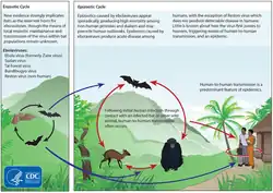 Geralmente, a transmissão entre o reservatório natural e os seres humanos é rara, e em cada surto é possível identificar o caso de origem, no qual alguém manuseou carcaças de gorilas, chimpanzés ou Cephalophinae.[43] Os morcegos-da-fruta são também uma fonte alimentar em algumas regiões da África ocidental, onde são fumados, grelhados ou usados na preparação de sopa.[40][44]