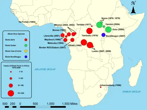 O primeiro caso identificado de ébola foi registrado em 26 de agosto de 1976, em Yambuku, uma pequena vila rural no distrito de Mongala, no norte da República Democrática do Congo (então conhecida como Zaire).[82]