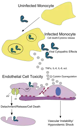 Os principais alvos da infeção são as células endoteliais, os fagócitos mononucleares e os hepatócitos. Após a infeção, é sintetizada uma glicoproteína segregada (sGP) denominada glicoproteína do vírus do ébola (GP). A replicação do vírus do ébola ultrapassa a própria síntese proteica das células infetadas e das defesas imunitárias do hospedeiro. A GP forma um complexo trimérico, o qual liga o vírus às células endoteliais que revestem a superfície interior dos vasos sanguíneos. A sGP forma um dímero proteico que interfere com a sinalização dos neutrófilos (um tipo de glóbulos brancos), o que permite ao vírus esquivar-se do sistema imunitário inibindo os primeiros passos da ativação dos neutrófilos. Estes glóbulos brancos também atuam como contentores para o transporte do vírus pelo corpo do hospedeiro, depositando-o nos gânglios linfáticos, fígado, pulmões e baço.[45]