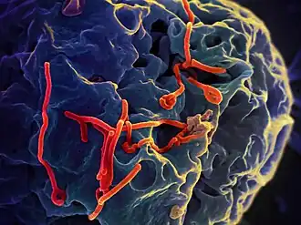 Micrografia eletrônica de varredura do vírus de ébola (em vermelho) sobre a superfície de uma célula de cultivo.