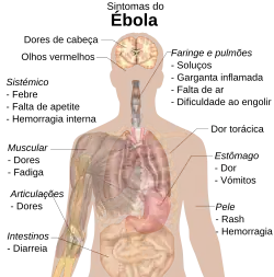 O período de incubação do vírus ébola dura de 5 a 7 dias se a transmissão for parenteral e de 6 a 12 dias se a transmissão for de pessoa a pessoa. O início dos sintomas é súbito com febre alta, calafrios, dor de cabeça, anorexia, náusea, dor abdominal, dor de garganta e prostração profunda. Em alguns casos, entre o quinto e o sétimo dia de doença, aparece exantema de tronco, anunciando manifestações hemorrágicas: conjuntivite hemorrágica, úlceras sangrentas em lábios e boca, sangramento gengival, hematemese (vômito com presença de sangue) e melena (hemorragia intestinal, em que as fezes apresentam sangue). Nas epidemias observadas, todos os casos com forma hemorrágica evoluíram para morte. Nos períodos epidêmicos e de surtos, a taxa de letalidade variou de 50 a 90%. Seu contágio pode ser por via respiratória ou contato com fluidos corporais de uma pessoa infectada.[45]