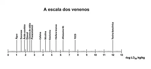 Pode-se construir uma escala logarítmica de toxicidade atribuindo-se um valor adimensional, calculado como −log10(LD50), para cada substância. Isso porque a amplitude dos valores de LD50 observados é muito elevada, podendo variar em mais de dez ordens de grandeza — como é o caso da água e da toxina botulínica, que apresentam, respectivamente, LD50 de cerca de 90 g/kg e 0.000000001 g/kg (ou 1 ng/kg).