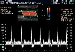 A maioria dos aparelhos modernos utiliza ultrassons Doppler pulsados, produzindo um Doppler de fluxo colorido, para medir o fluxo no centro ou na periferia de um vaso sanguíneo.[3] Os dispositivos de onda pulsada transmitem e recebem uma série de impulsos, recebendo geralmente a informação antes de enviar o próximo. A variação da frequência de cada pulso é ignorada, mas as variações de fase relativas dos pulsos são utilizadas para obter a variação da frequência, uma vez que a frequência é a taxa de variação dessa fase. A principal vantagem do Doppler pulsado em relação à variedade de onda contínua é que a informação da distância é obtida (o tempo entre a transmissão e a recepção dos impulsos pode ser convertido em distância, conhecendo-se a velocidade do som). A desvantagem do Doppler pulsado é que as medições podem sofrer aliasing. O termo "ecografia Doppler" ou "sonografia Doppler" tem sido aceite para se referir às versões pulsada e contínua, apesar dos diferentes mecanismos pelos quais cada uma mede o fluxo.