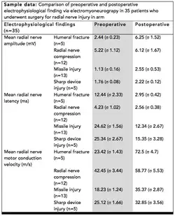 A eletroneuromiografia também pode ser usada para medir a recuperação do paciente a partir de procedimentos cirúrgicos, como o reparo do nervo. Um estudo realizado em pacientes com lesões do nervo proximal usou o procedimento para indicar o grau de lesão nervosa pré e pós-operatória.[8] Neste estudo particular, a eletroneuromiografia foi o método preferido de medição da recuperação, escolhido em imagens de ressonância magnética (MRI) e tomografia computadorizada (TC). Ao olhar para a tabela de dados da amostra, pode-se ver que os pacientes pós-operatórios geralmente vêem um aumento na amplitude média do nervo radial, uma diminuição da latência do nervo radial médio e aumentos na velocidade de condução do motor nervoso. Esses resultados são todas tendências gerais que seriam esperadas quando operavam em nervos danificados no esforço para aumentar seu desempenho.