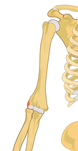 O epicôndilo lateral do úmero é uma proeminência situada na extremidade distal do úmero. Dá inserção ao ligamento colateral radial e aos músculos extensores superficiais do antebraço, que são o extensor radial curto do carpo, extensor dos dedos, extensor do dedo mínimo, extensor ulnar do carpo, e para o supinador.[1]