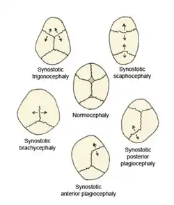 O termo Escafocefalia aplica-se à fusão prematura da sutura sagital. A sutura sagital une os dois ossos parietais do crânio. A escafocefalia é a mais comum das craneoestenoses e caracteriza-se por uma cabeça longa e estreita. Existe uma variante denominada Escafocefalia Posicional, conhecida também por dolicocefalia, que produz uma deformação cranial não sinostósica. Descreve uma cabeça longa e estreita desde uma vista superior. Esta deformação é comum em meninos prematuros.