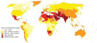No século XX, o uso de água cresceu mais que o dobro da taxa de crescimento populacional. Especificamente, é provável que as retiradas de água aumentem em 50% até 2025 nos países em desenvolvimento e em 18% nos países desenvolvidos. Prevê-se que um continente, por exemplo, África, tenha entre 75 e 250 milhões de habitantes sem acesso a água doce.[59] Em 2025, 1,8 bilhão de pessoas viverão em países ou regiões com escassez absoluta de água e dois terços da população mundial poderão estar em condições de stress.[60] Em 2050, mais de metade da população mundial viverá em áreas com escassez de água e outros bilhões poderão não ter água suficiente, segundo descobriram investigadores do MIT.[61]