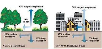O escoamento urbano é o escoamento superficial de águas de chuva, irrigação da e lavagem de carros[1] originados da urbanização. Superfícies impermeáveis ( estradas, estacionamentos e calçadas) são construídas durante o desenvolvimento urbano . Durante chuvas, tempestades e outros eventos de precipitação, essas superfícies (construídas a partir de materiais como asfalto e concreto), juntamente com os telhados, transportam águas pluviais poluídas para bueiros, em vez de permitir que a água percole (infiltre) solo.[2] Isso causa rebaixamento do lençol freático e inundações.[3][4]