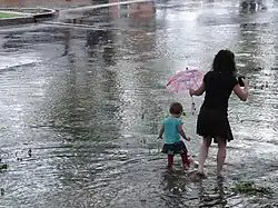O escoamento urbano é uma das principais causas de inundações urbanas, a inundação de terrenos ou propriedades em um ambiente construído causada por chuvas que sobrecarregam a capacidade dos sistemas de drenagem, como os esgotos pluviais.[12] Desencadeada por eventos como inundações repentinas, marés de tempestades, inundações nas margens ou derretimento da neve, as inundações urbanas são caracterizadas por seus impactos repetitivos, onerosos e sistêmicos nas comunidades, mesmo quando não dentro de várzeas ou próximo a qualquer corpo d'água.[13]