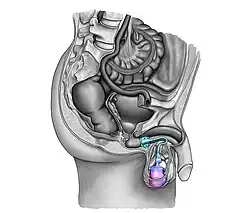 - O esfíncter urinário artificial com mola (2 componentes): manguito de controle e bomba.[3][4] O manguito de controle é colocado ao redor da uretra, e a bomba é inserida dentro do escroto. A pressão do circuito hidráulico é gerada pela mola na bomba. A pressão no espaço retropúbico não influencia esse tipo de esfíncter.
