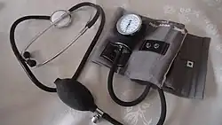 O esfigmomanômetro (português brasileiro) ou esfigmomanómetro (português europeu) é um aparelho para verificar a pressão arterial (PA). Consiste num sistema para compressão da artéria braquial. É composto por uma bolsa inflável de borracha de formato laminar, a qual é envolvida por uma capa de tecido inelástico (braçadeira, cuff com manguito = bladder) e conectada por um tubo de borracha a um manômetro e por outro tubo, que contém uma válvula controlada pelo operador, conectado a uma pêra, que tem a finalidade de insuflar a bolsa pneumática. Usado para medida indireta da pressão arterial.