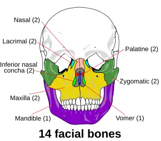 No crânio humano, o esqueleto facial consiste em quatorze ossos da face:[1][2]